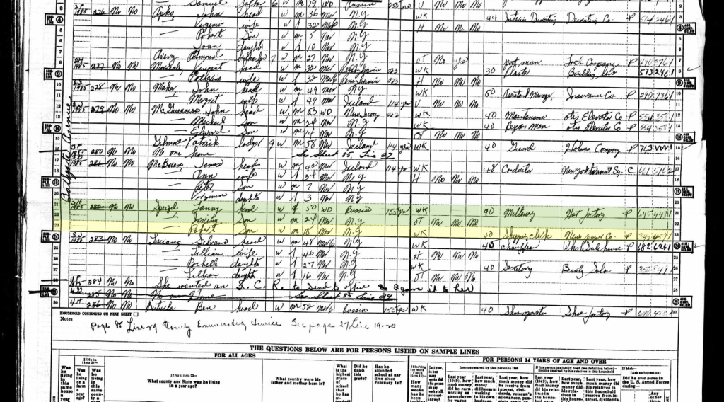 Fruma (then going by Fanny) took up residence with her cousin Ethel (nee Ruchlin) and Ethel’s husband Samuel Steinberg, on 15th Street, Brooklyn. Soon thereafter, Ethel gave birth to her first child, a daughter named Theresa. The 1920 census states that Fanny was Russian, didn’t speak English but, rather, spoke Hebrew, and worked as a milliner in a millinery store. The 1920 census also states that Fanny was age 25, which lines up with her being age 24 in the prior year’s ship manifest.