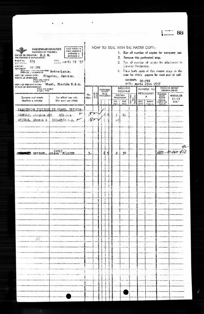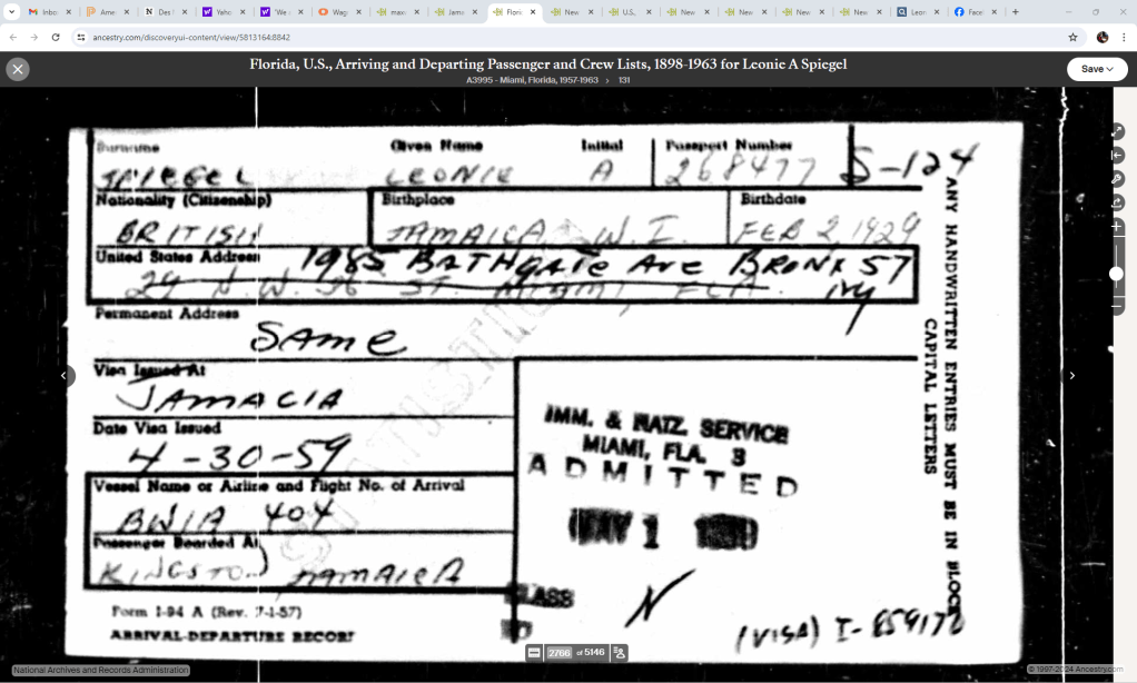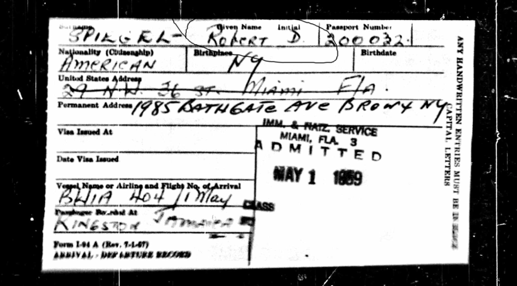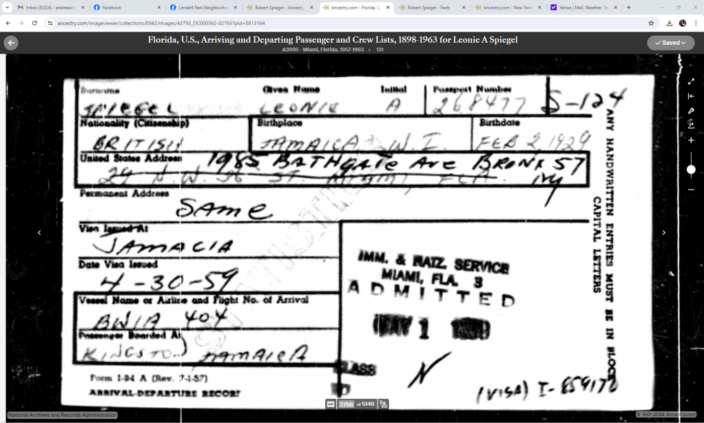 On May 1, 1959, three residents of 1985 Bathgate Avenue, Bronx, New York, came through customs, having returned from a trip to Jamaica. They identified themselves as “Robert D. Spiegel” born in New York (in addition to giving himself a false middle initial, Robert neglected to complete the I-94-A fully, specifically by leaving his birthdate blank), “Leonie A. Spiegel” born in Jamaica on February 2, 1929, and their minor daughter, and “Sharon S. Spiegel,” born in New York. Someone also neglected to fully complete Sharon’s I-94-A, specifically by leaving her birthdate blank.