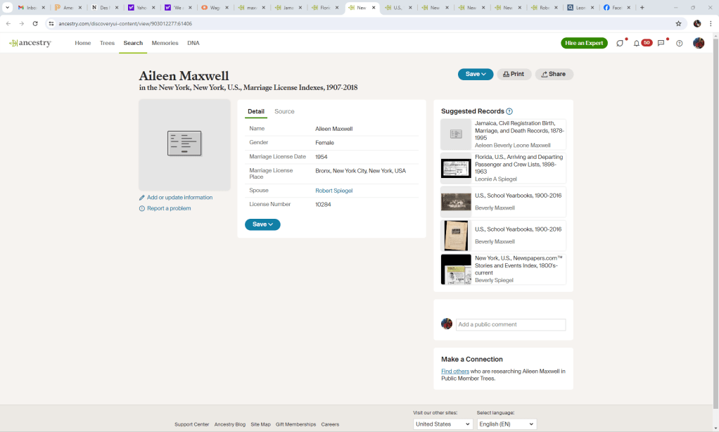 In 1954, Robert Spiegel and Aileen Maxwell were married in New York City. Their marriage license was given License No. 10284.