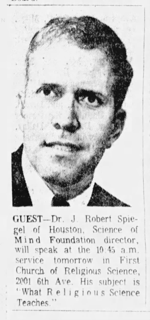 GUEST – Dr. J Robert Spiegel of Houston, Science of Mind Foundation director, will speak at the 10:45 a.m. service tomorrow in First Church of Religious Science, 2001 6th Ave. His subject is “What Religious Science Teaches.”