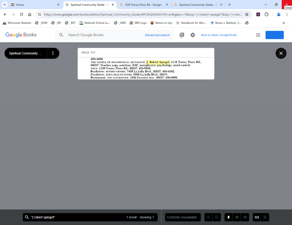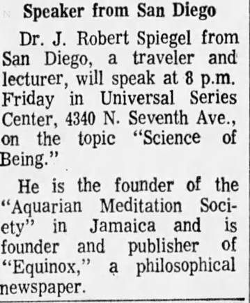 The 1975 Spiritual Community Guide lists Robert twice, in the San Diego area. First, on page 117, using his alias “J. Robert Spiegel”: