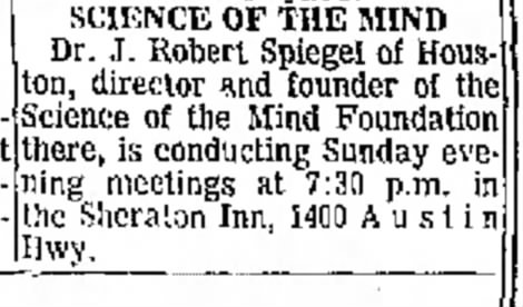 Dr. J. Robert Spiegel of Houston, director and founder of the Science of the Mind Foundation there, is conducting Sunday evening meetings at 7:30 p.m. in the Sheraton Inn, 1400 Austin Hwy.