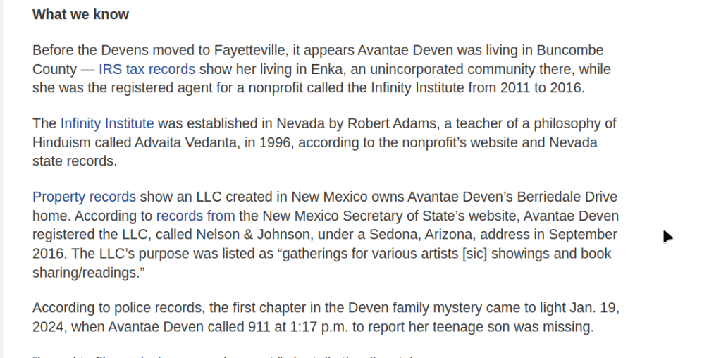 This started with research regarding Avantae Deven, a North Carolina resident who is being investigated regarding the disappearance and presumed murder of two of her adopted children. Our focus should largely be on locating those children, and bringing Avantae Deven to justice.