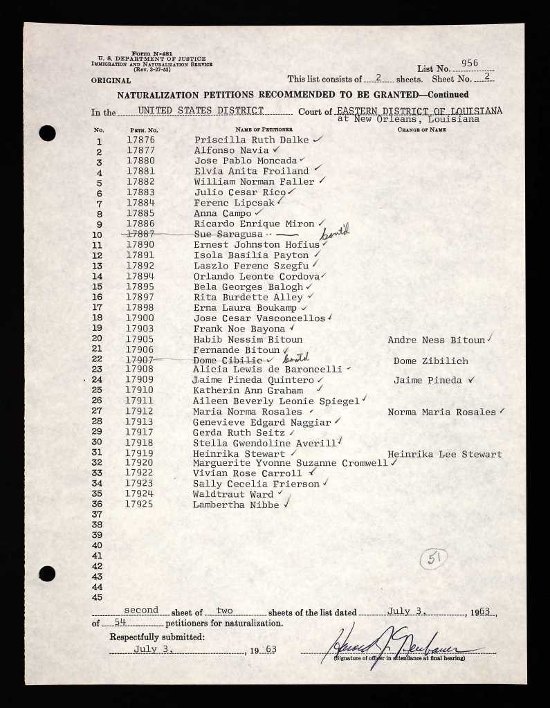 In 1963, roughly five years after their 1958 visit to Jamaica, Leonie petitioned for naturalization, in Louisiana. Although I am in possession of the index showing that she petitioned in 1963, I do not possess the petition itself. However, the fact that she petitioned for naturalization in Louisiana demonstrates that at least she was residing in Louisiana at the time. Since she stated that she didn’t leave Robert’s side for over 40 years, presumably Robert, young Sharon, and also baby Michelle were living in Louisiana at that time.