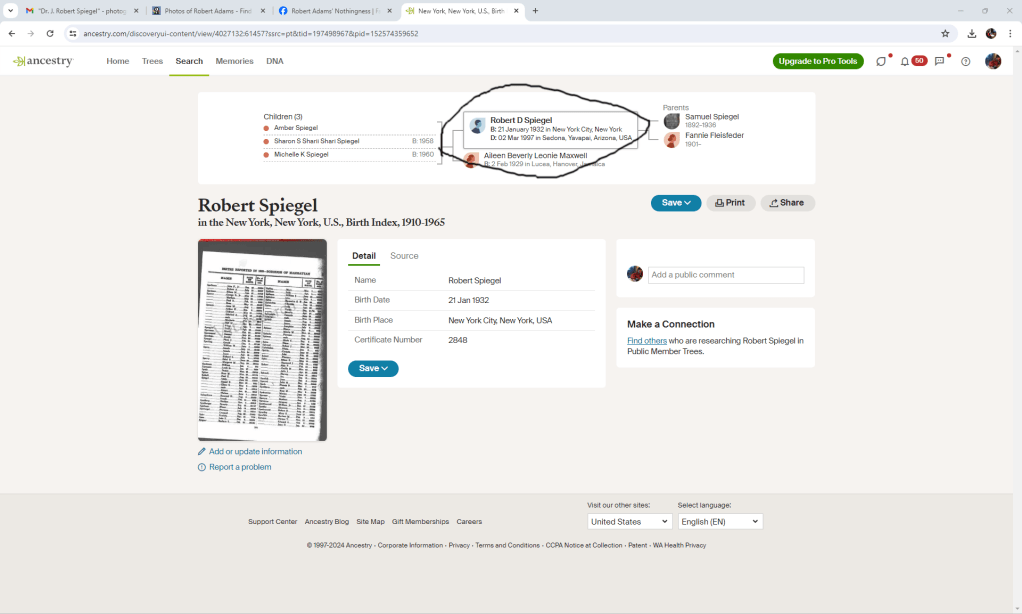The New York Birth Index identifies a baby boy, Robert Spiegel, as one of many babies having been born in the city on January 21, 1932.