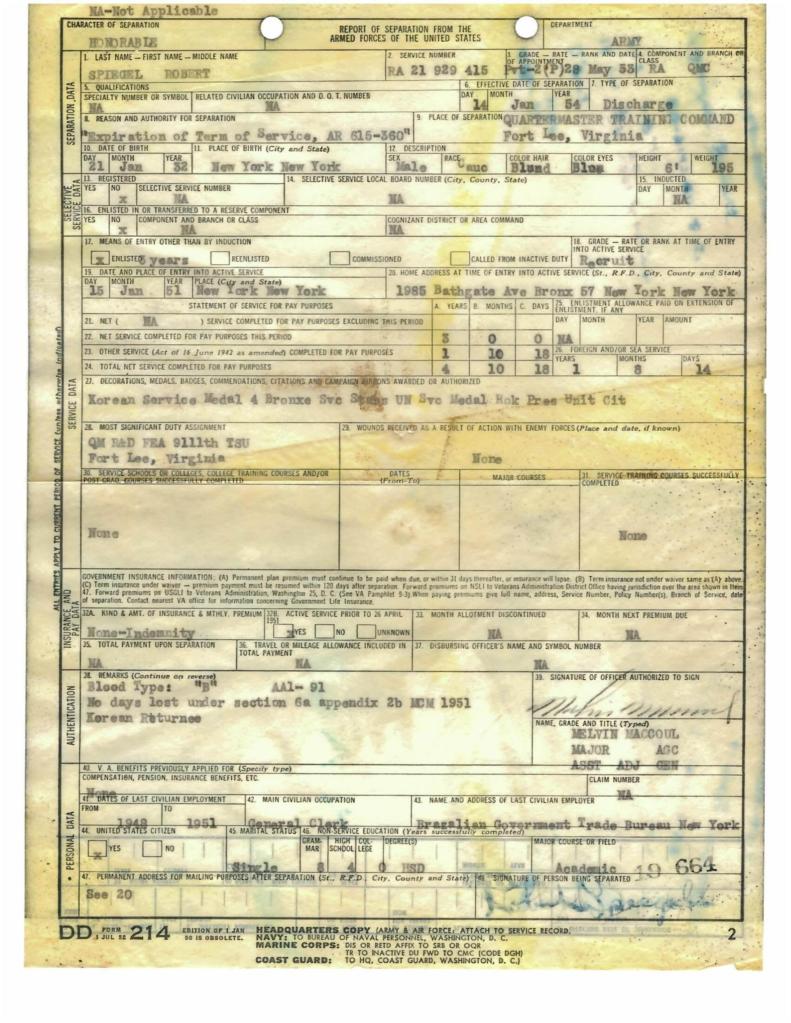 On December 9, 1949, Robert was discharged from the national guard, and apparently went on active duty in the 991st BN and was stationed for at least some time in Korea.
